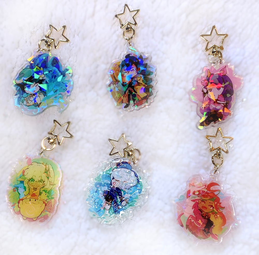 Even the gods could use some time with a friend. These 2.5" charms feature one of the first six Archons of Teyvat enjoying a moment with their companions, animal, elemental or otherwise. Five of the charms (Venti, Zhongli, Raiden, Nahida Mavuika) feature broken glass holographics on both sides, while the sixth (Furina) features a water-like rippled surface on one side.