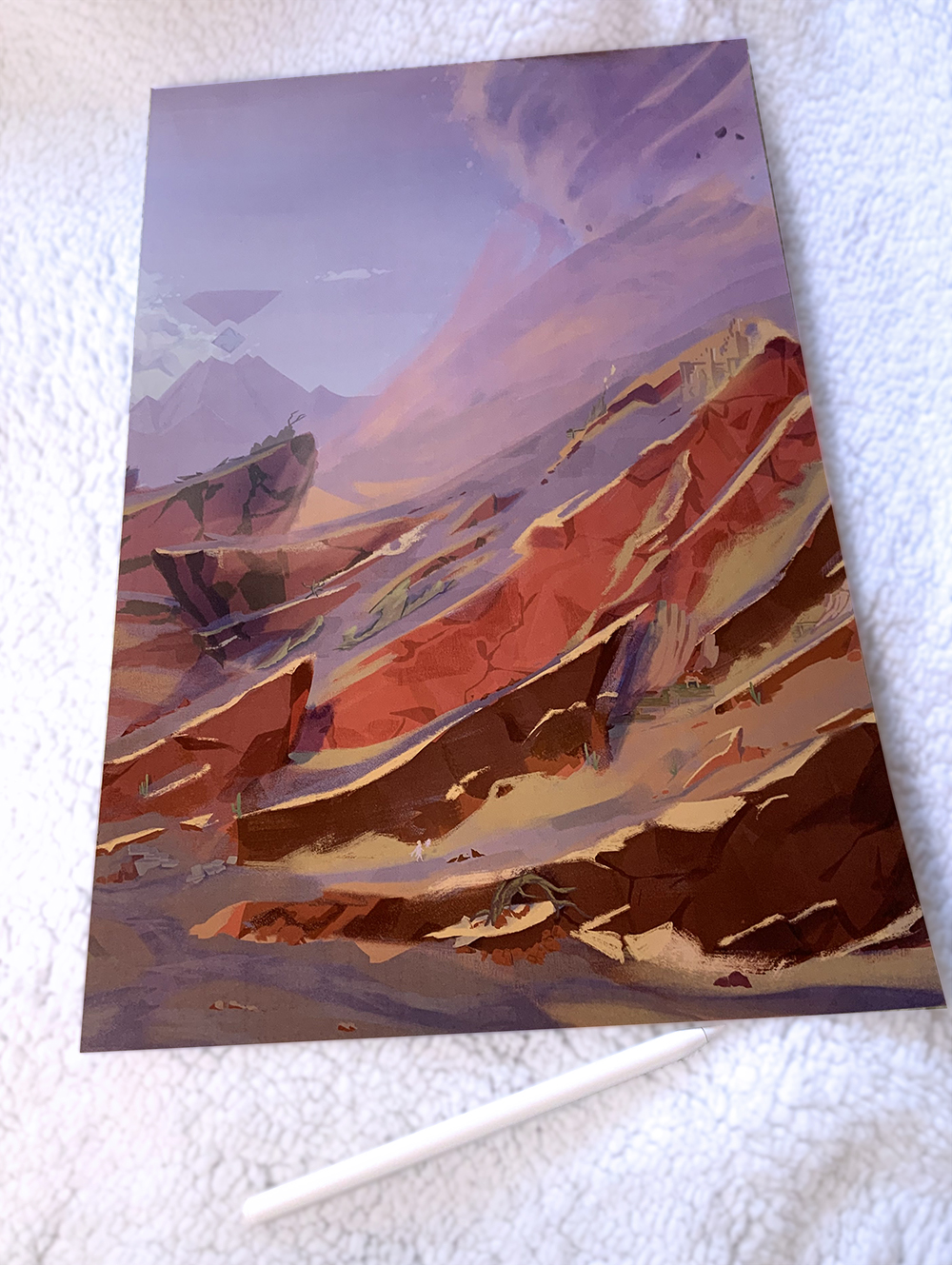 Revisit your adventure through the gilded deserts in the land of Dendro with this digital painting of Mt. Damavand. This glossy print measures 11" x 17" and is full bleed. Ships in a cardboard tube.