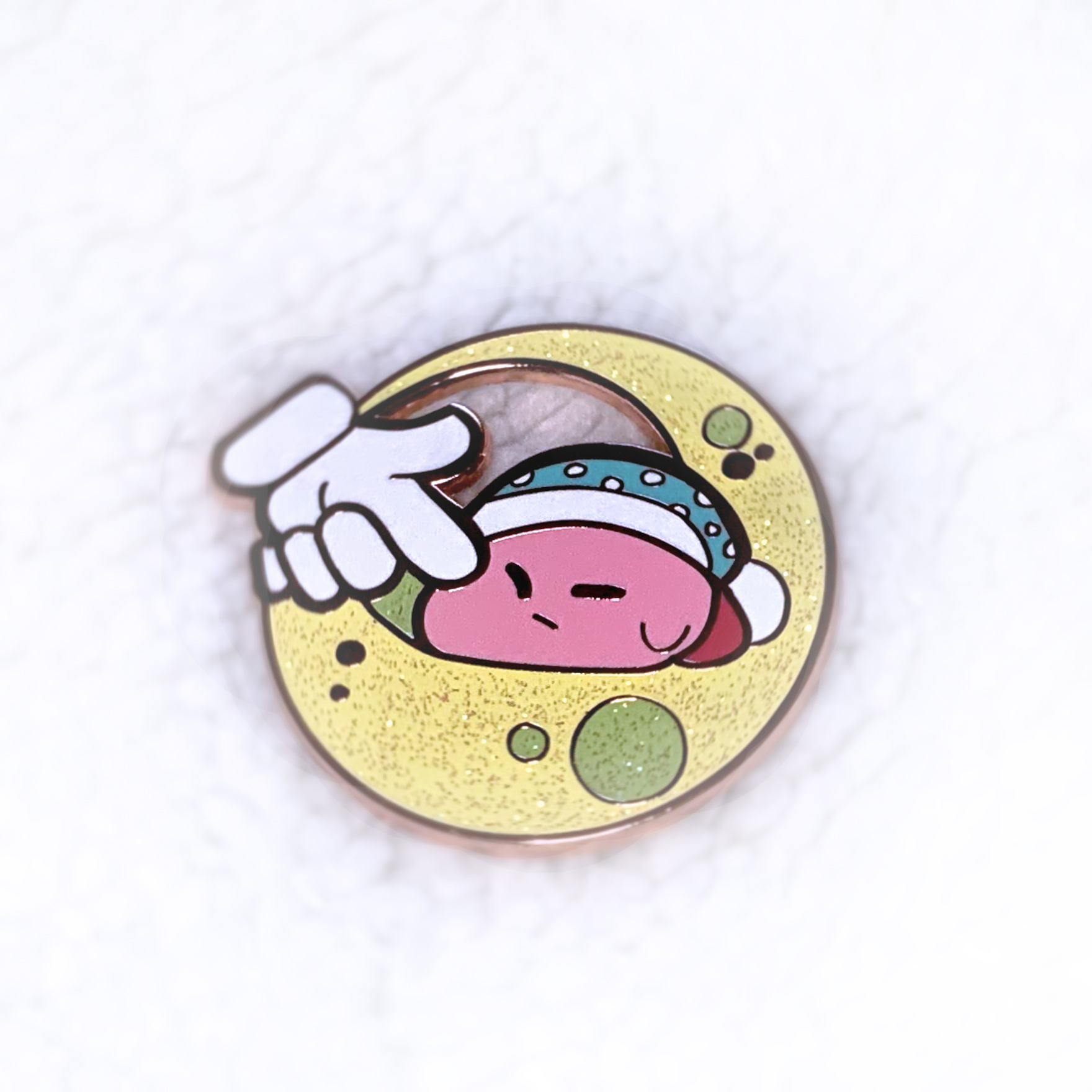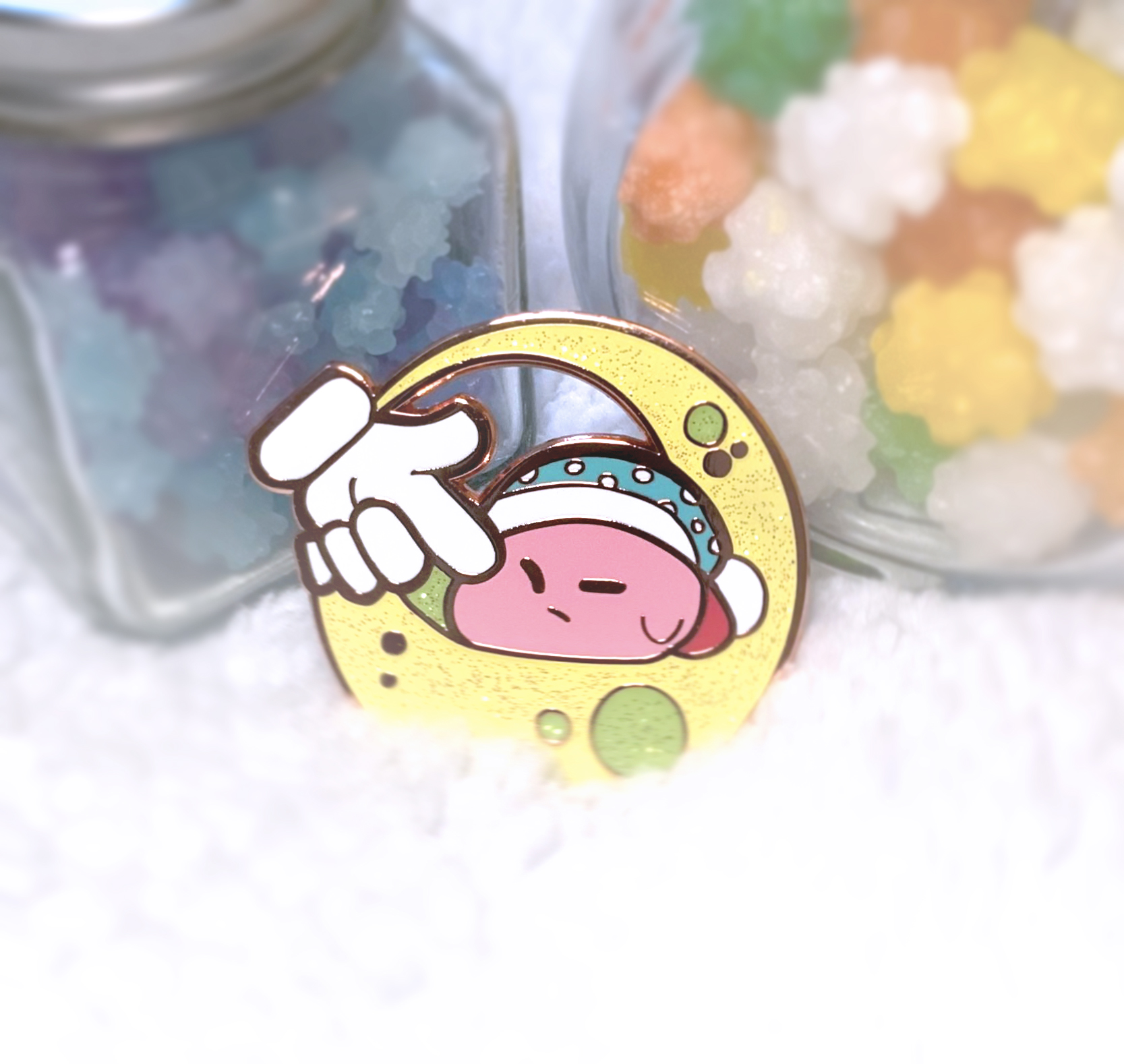 Continue? Nah, it's time to drift off to dreamland. This 2" hard enamel pin features our favorite pink puffball sleeping (mostly) soundly on a shimmering moon. With rose gold plating and a glitter finish on the moon's coloring, sweet dreams await.